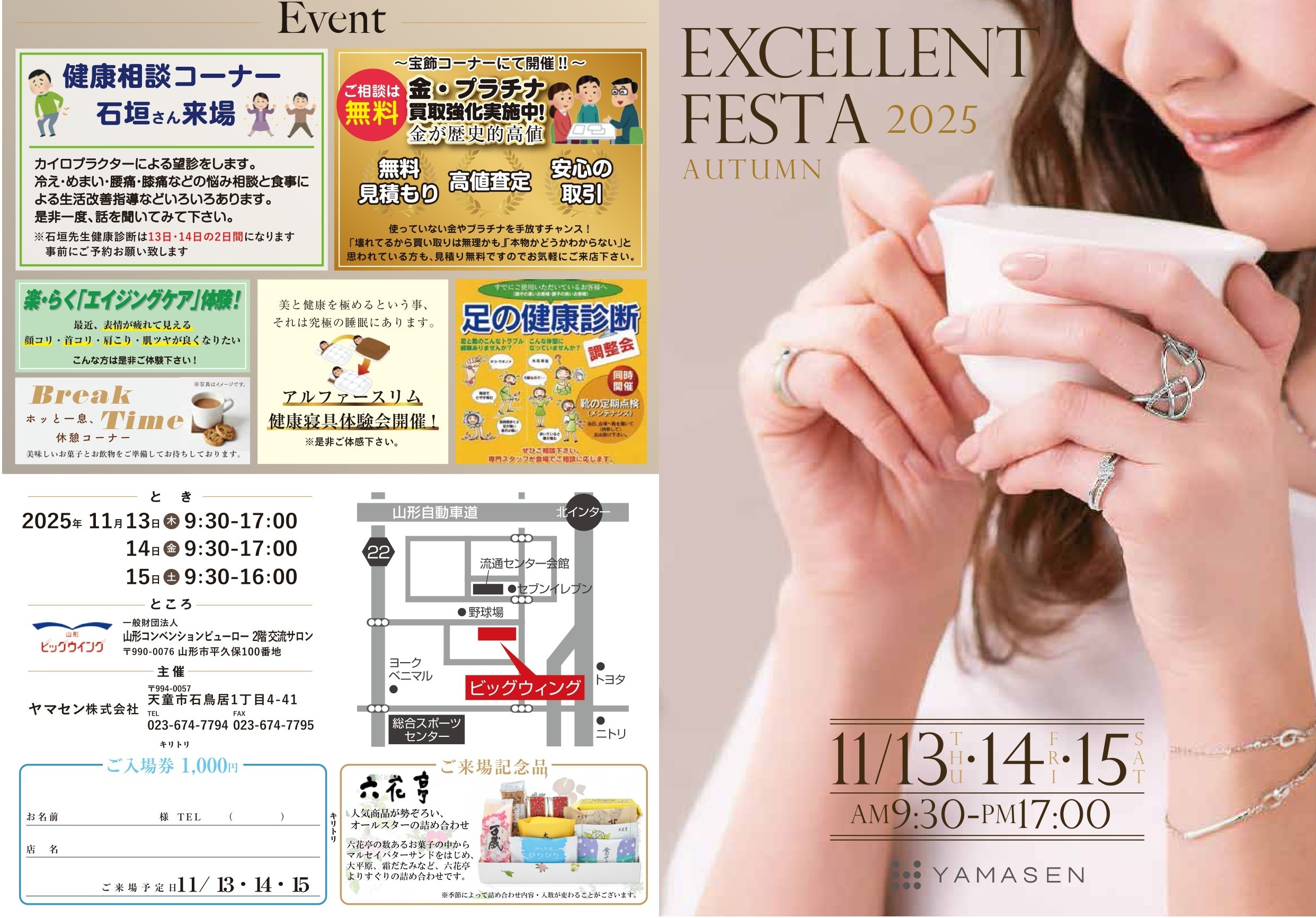 イベント エクセレントフェスタ2025 Autumnを開催いたします※11月13日(木)~15日(土) 2025.10.24 イベント 招待制になりますので、ご来店ご希望の方は弊社問い合わせフォームよりご連絡お願いいたします。 【KAMU】会員様限定!特別招待セールを開催します※10月24日(金)~10月26日(日) 前の記事 Harmonie TerrasseにてFカード会員様特別優待会を開催いたします※11月6日(木)~9日(日) 次の記事 新着のお知らせ KAMU会員様プレセールを開催いたします12月13日(土)~15日(月) 2025.12.04 KAMUイオンいわき店がオープンいたします※12月5日(金) 2025.12.02 【KAMU】BLACK FRIDAYラストスパートセールを開催いたします※11月29日(土)・30日(日) 2025.11.28
